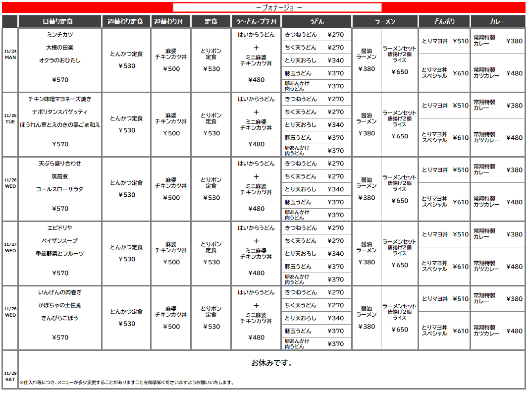 【摂南大】寝屋川:ブォナージョ 11月24日からの1週間メニュー