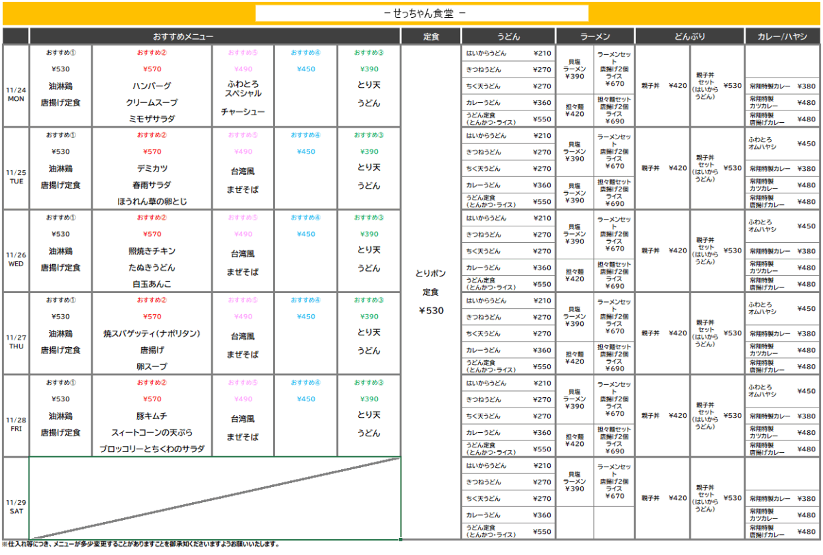 【摂南大】寝屋川:せっちゃん食堂 11月24日からの1週間メニュー