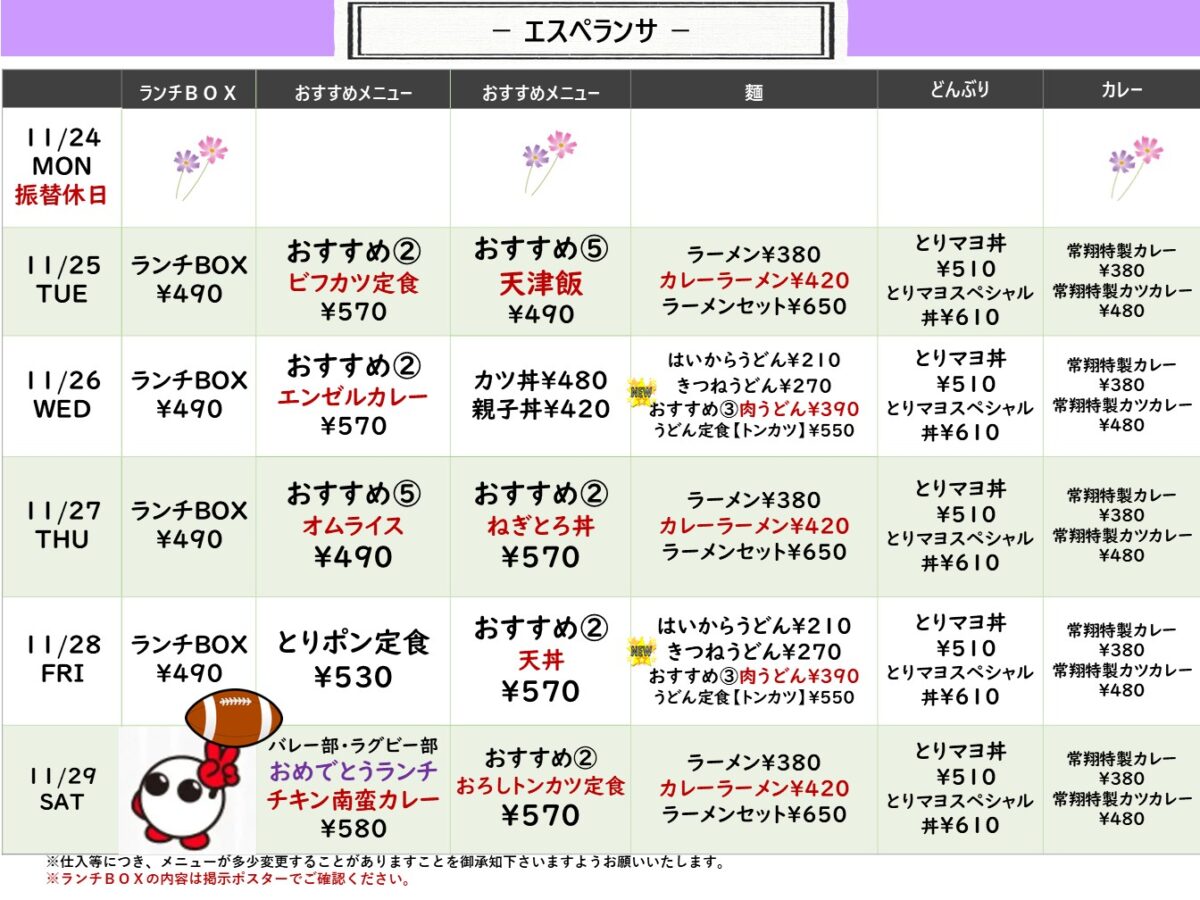 【常翔学園中・高】エスペランサ 11月24日からの1週間メニュー