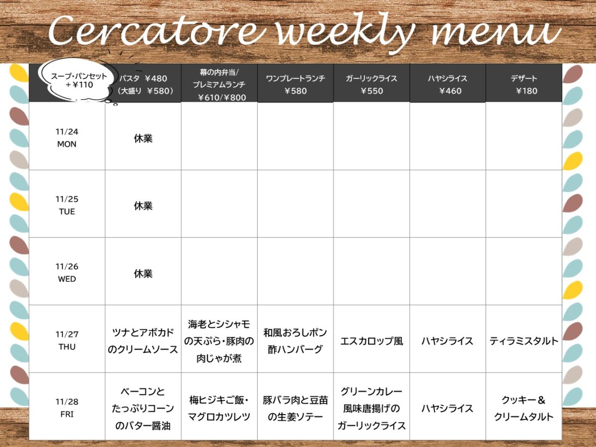 【大工大】大宮:チェルカトーレ 11月24日からの1週間メニュー