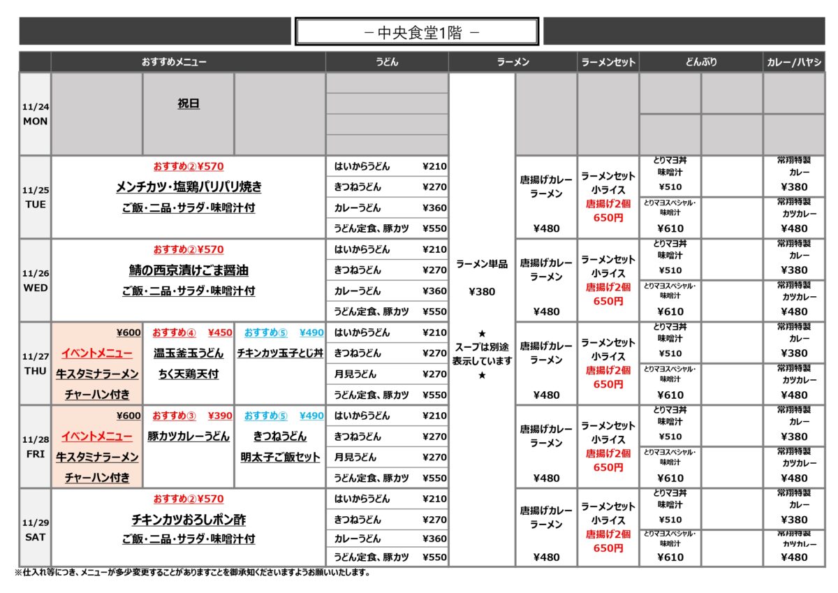 【大工大】大宮:中央食堂1階 11月24日からの1週間メニュー