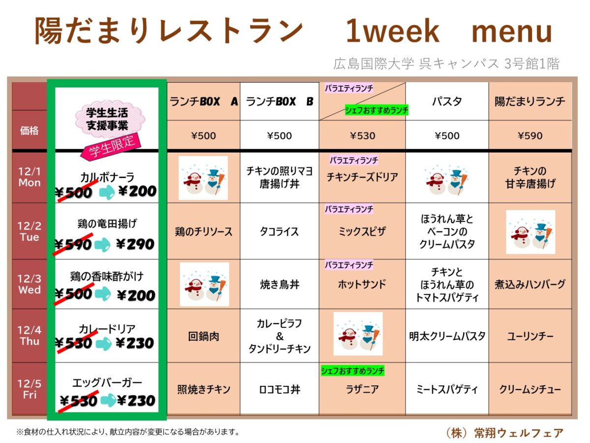 【広国大】呉: 陽だまりレストラン 12月1日からの1週間メニュー