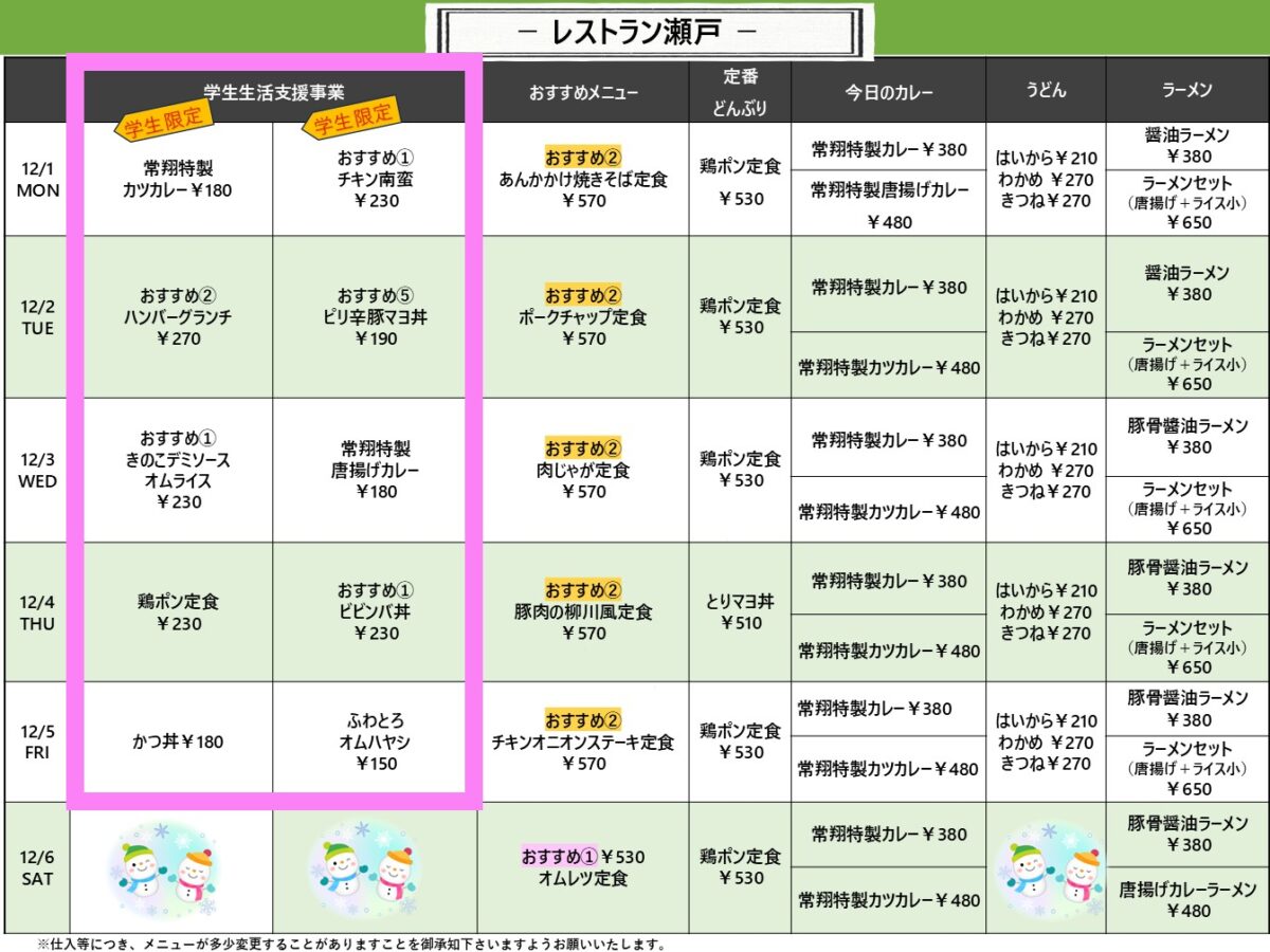 【広国大】呉: レストラン瀬戸 12月1日からの1週間メニュー