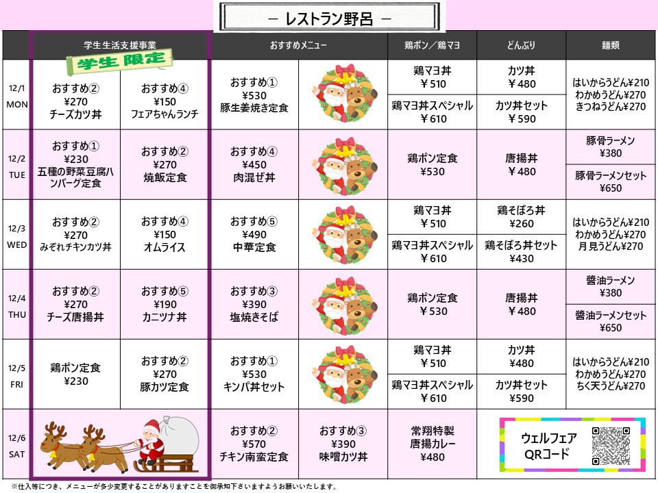 【広国大】東広島:レストラン野呂 12月1日からの1週間メニュー