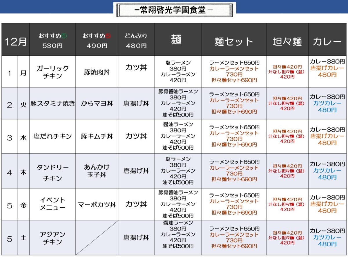 【常翔啓光中・高】啓光学園食堂 12月1日からの1週間メニュー