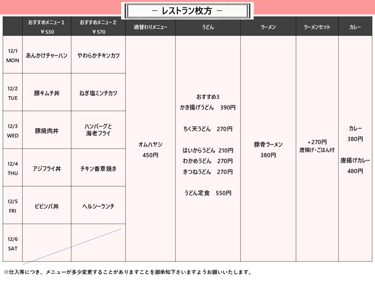 【摂南大】枚方:枚方食堂 12月1日からの1週間メニュー