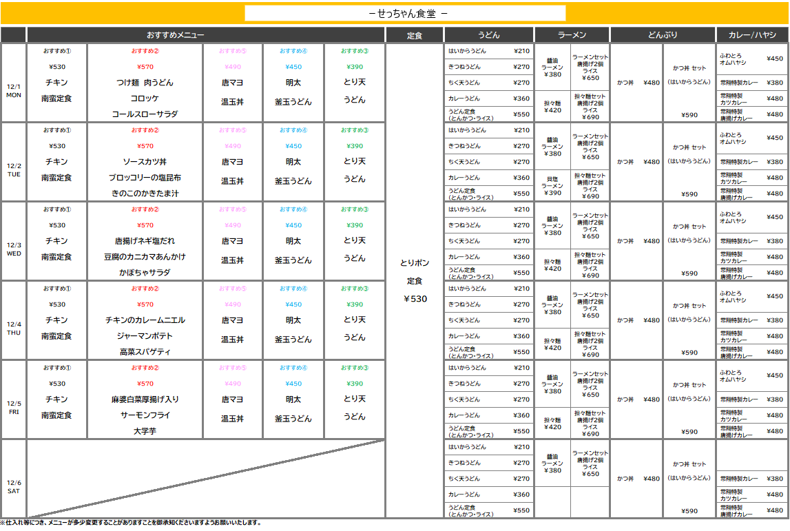 【摂南大】寝屋川:せっちゃん食堂 12月1日からの1週間メニュー