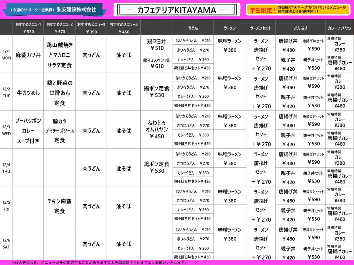 【大工大】枚方:カフェテリアKITAYAMA 12月1日からの1週間メニュー