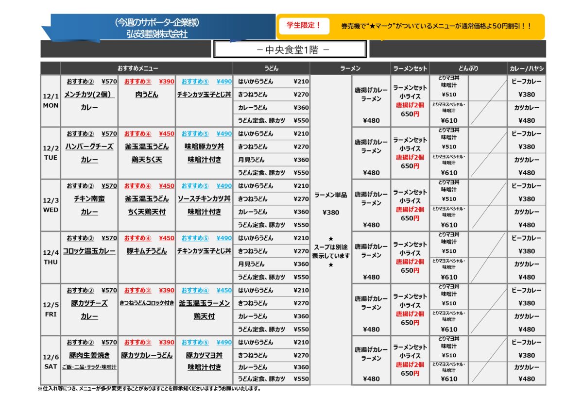 【大工大】大宮:中央食堂1階 12月1日からの1週間メニュー