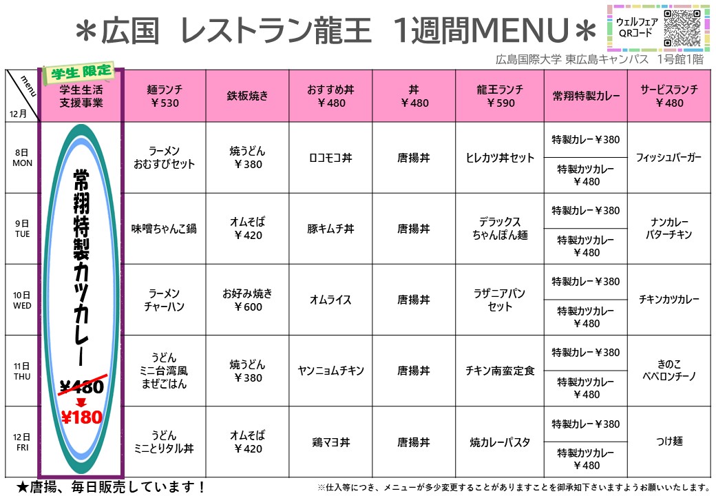 【広国大】東広島:レストラン龍王 12月8日からの1週間メニュー