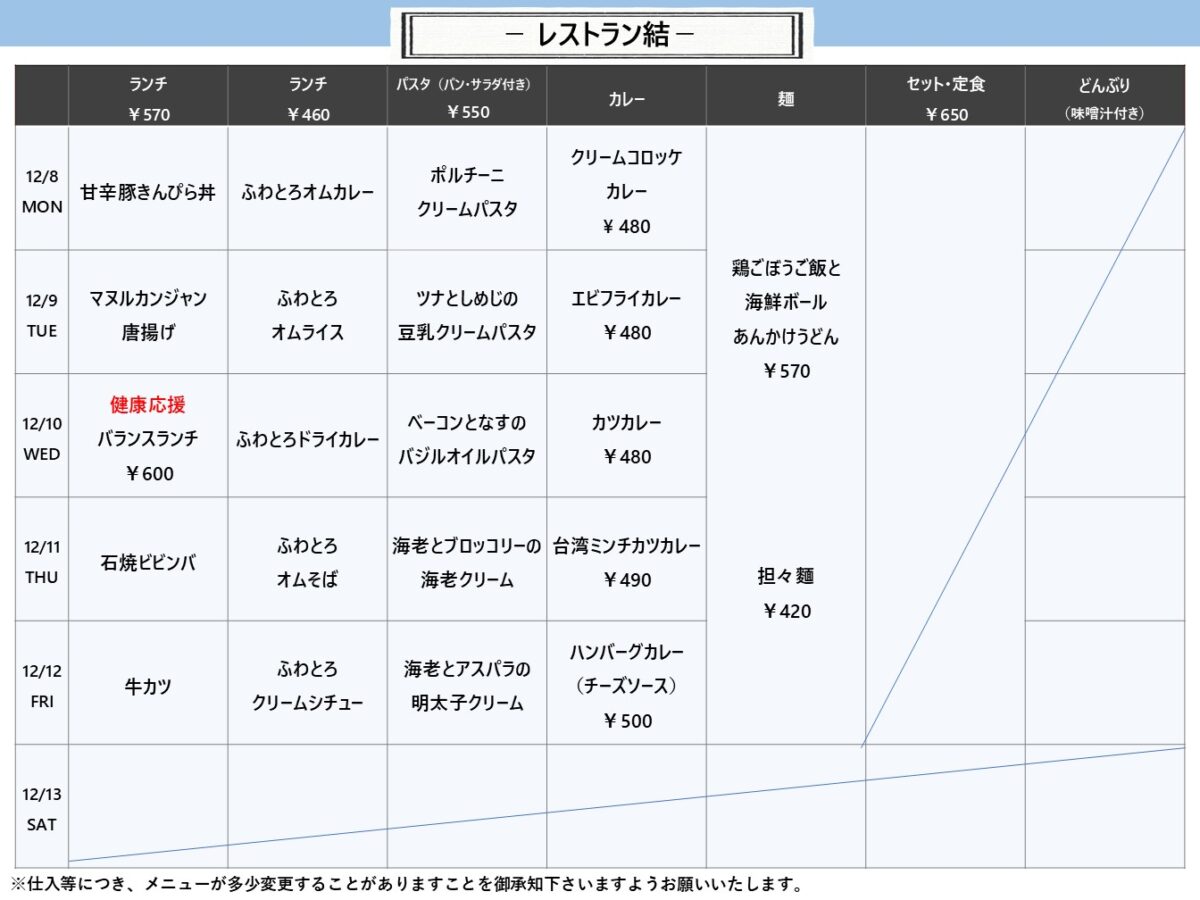 【摂南大】枚方:レストラン結 12月8日からの1週間メニュー