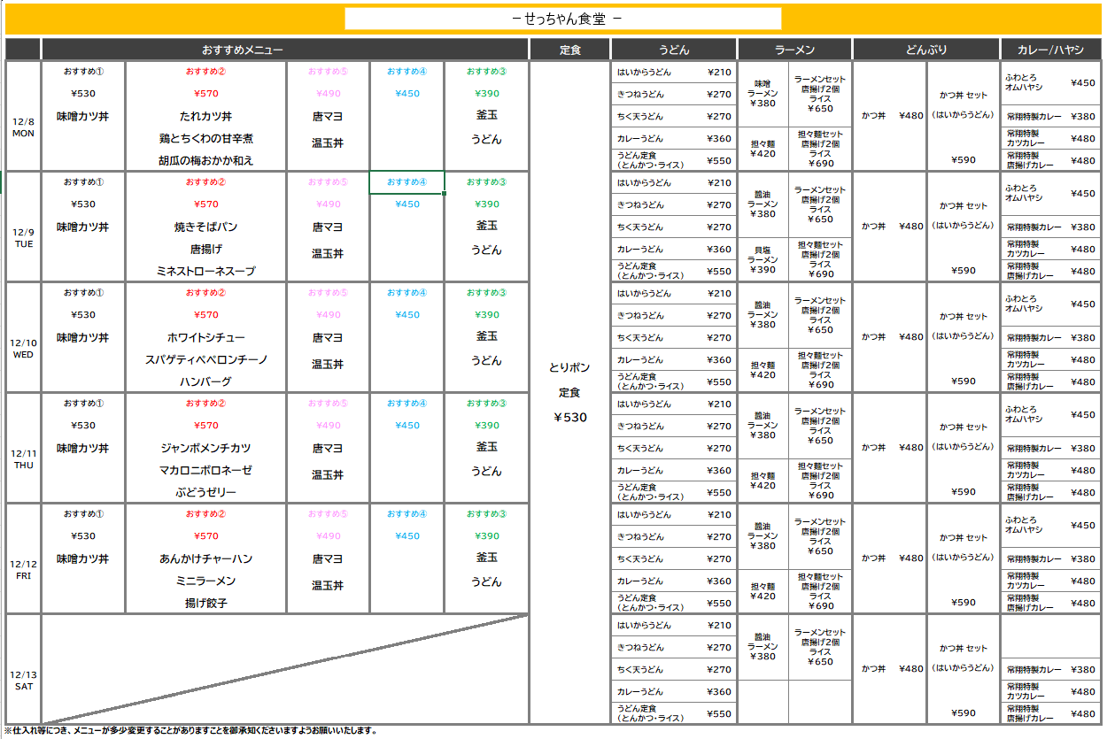 【摂南大】寝屋川:せっちゃん食堂 12月8日からの1週間メニュー