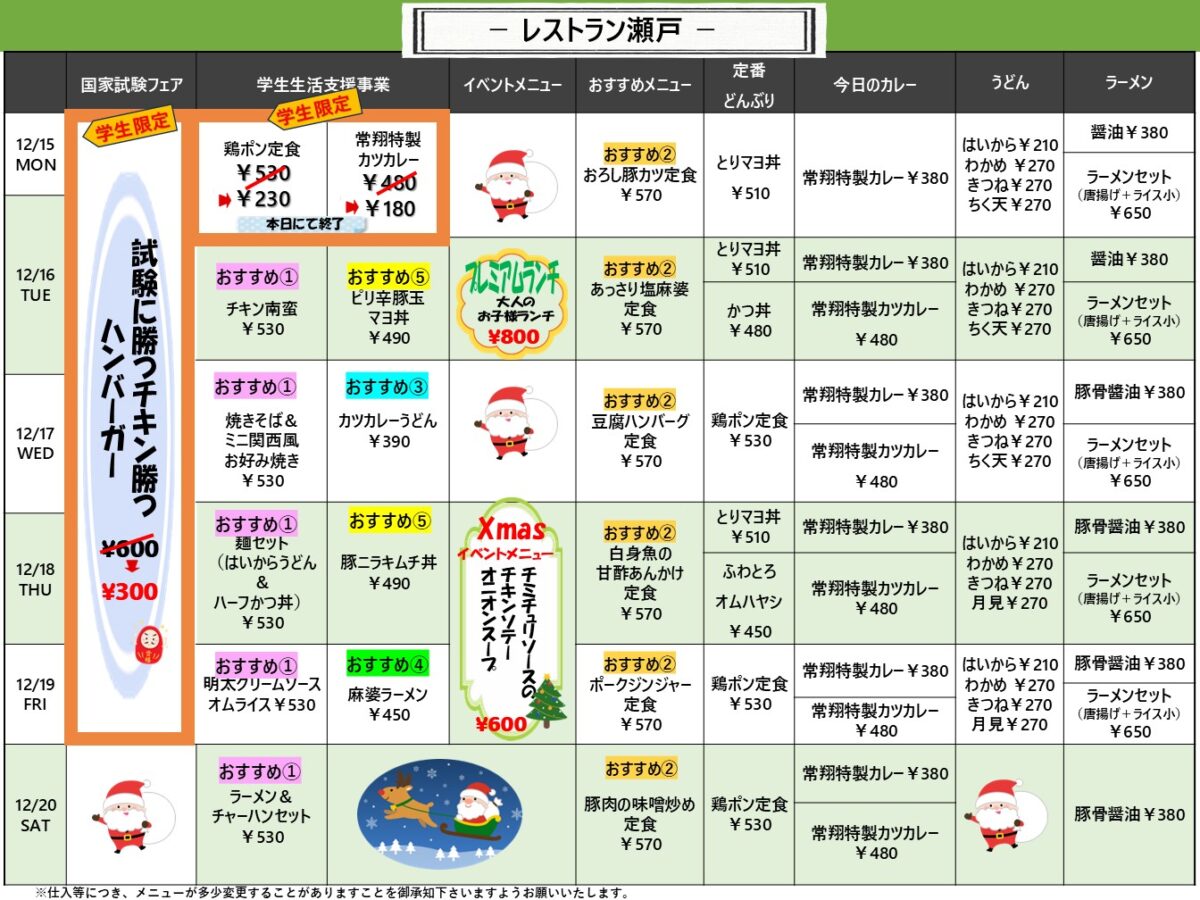 【広国大】呉: レストラン瀬戸 12月15日からの1週間メニュー