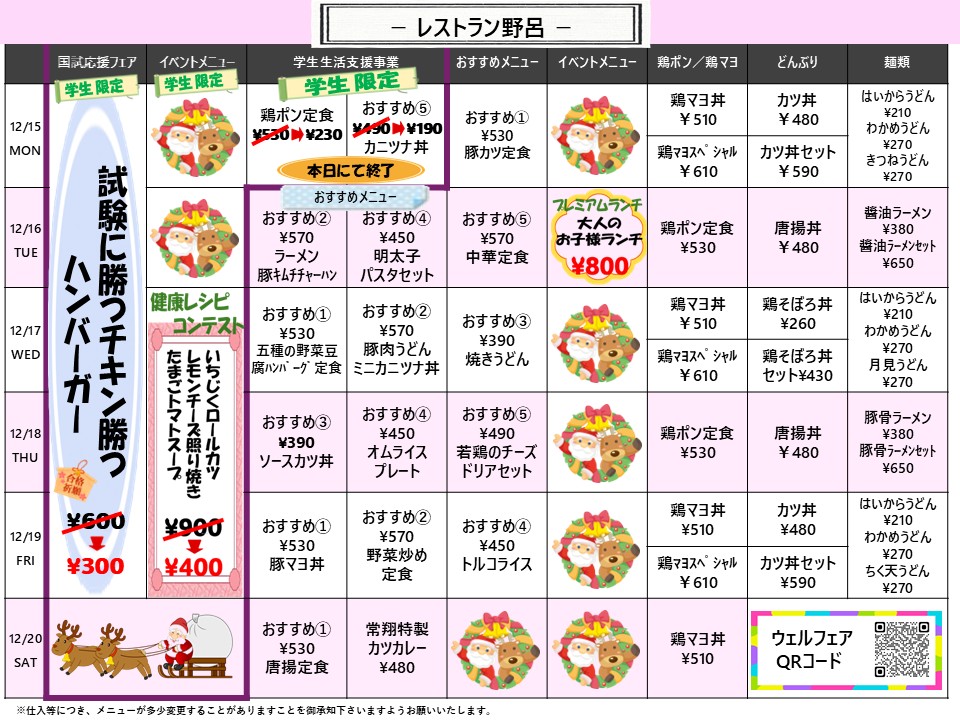 【広国大】東広島:レストラン野呂 12月15日からの1週間メニュー