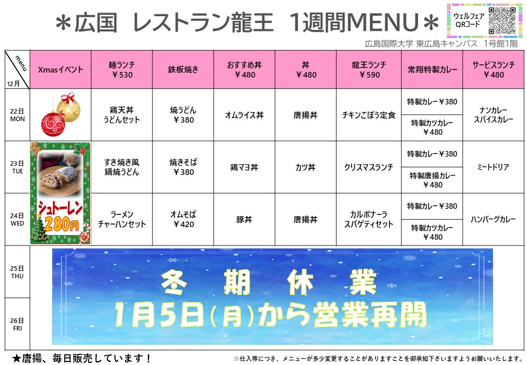 【広国大】東広島:レストラン龍王 12月22日からの1週間メニュー