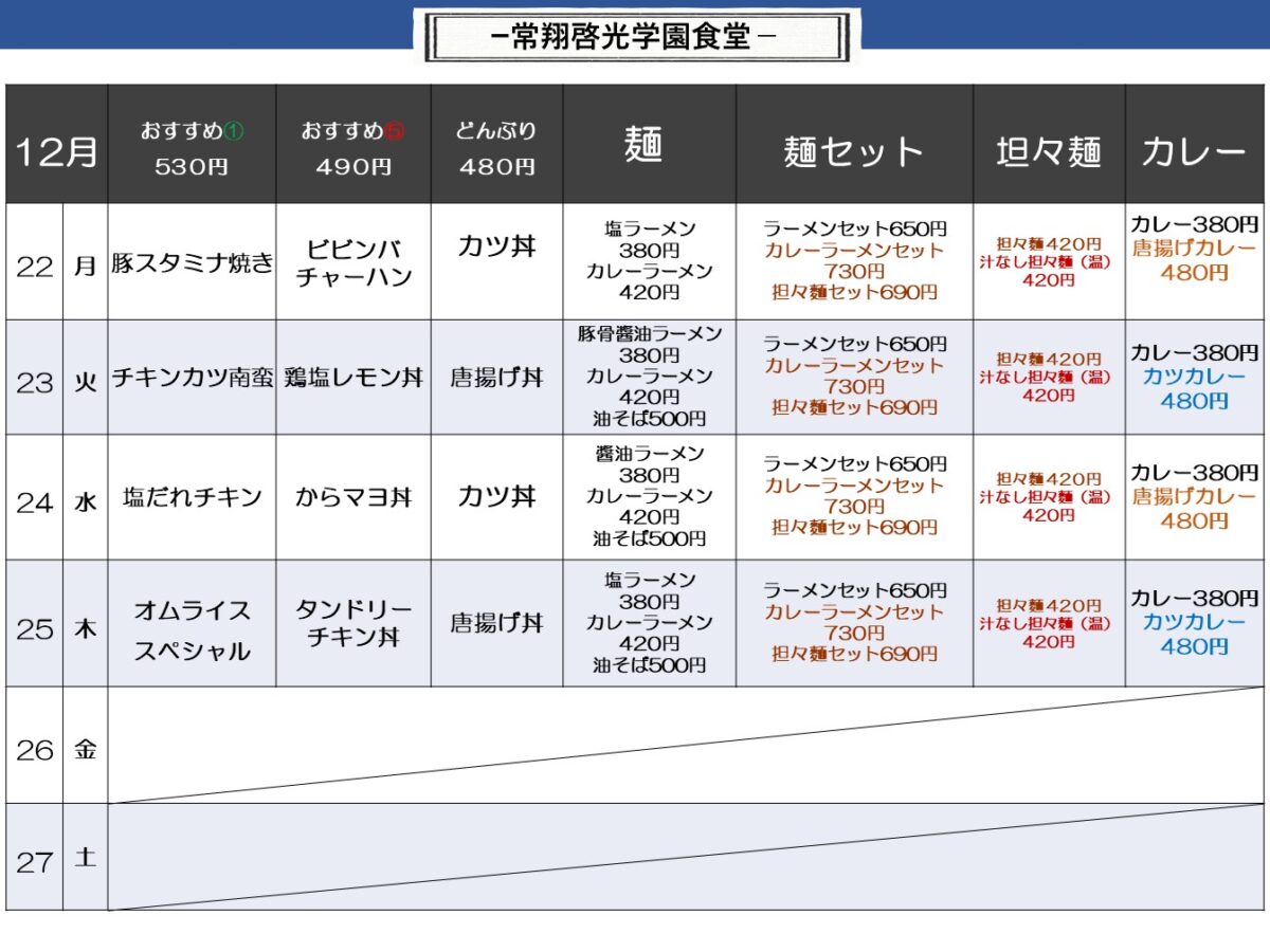 【常翔啓光中・高】啓光学園食堂 12月22日からの1週間メニュー