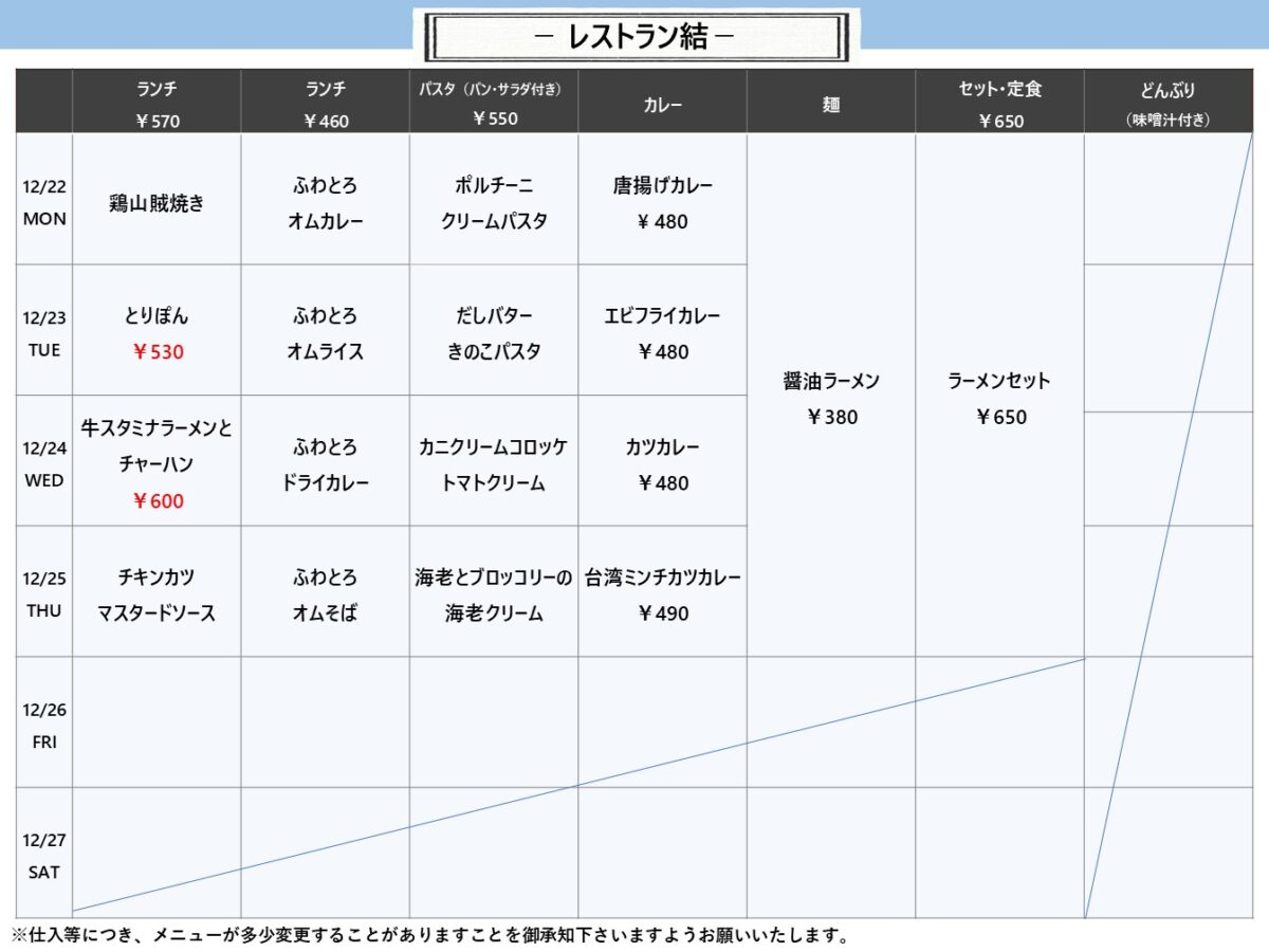 【摂南大】枚方:レストラン結 12月22日からの1週間メニュー