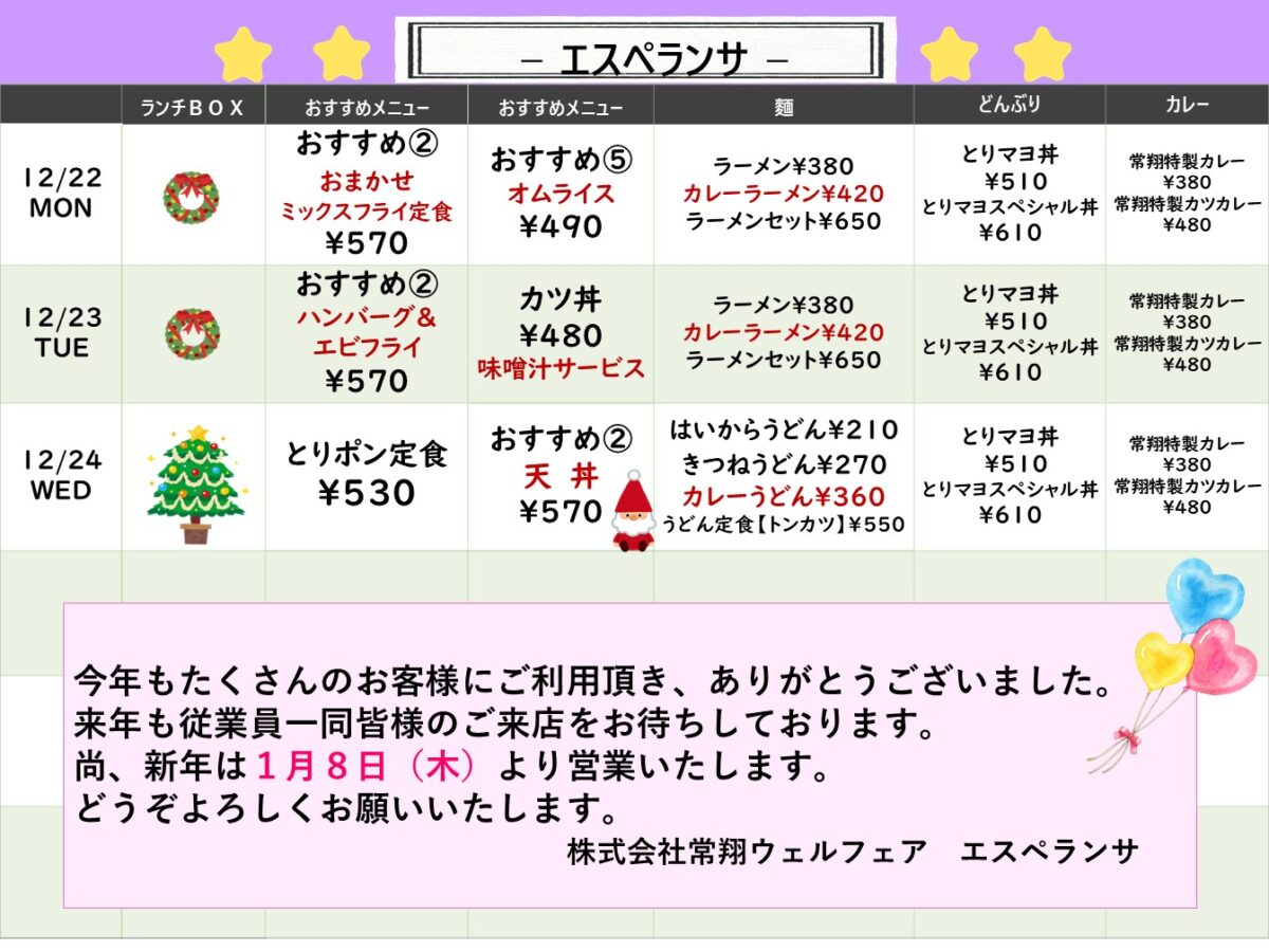 【常翔学園中・高】エスペランサ 12月22日からの1週間メニュー
