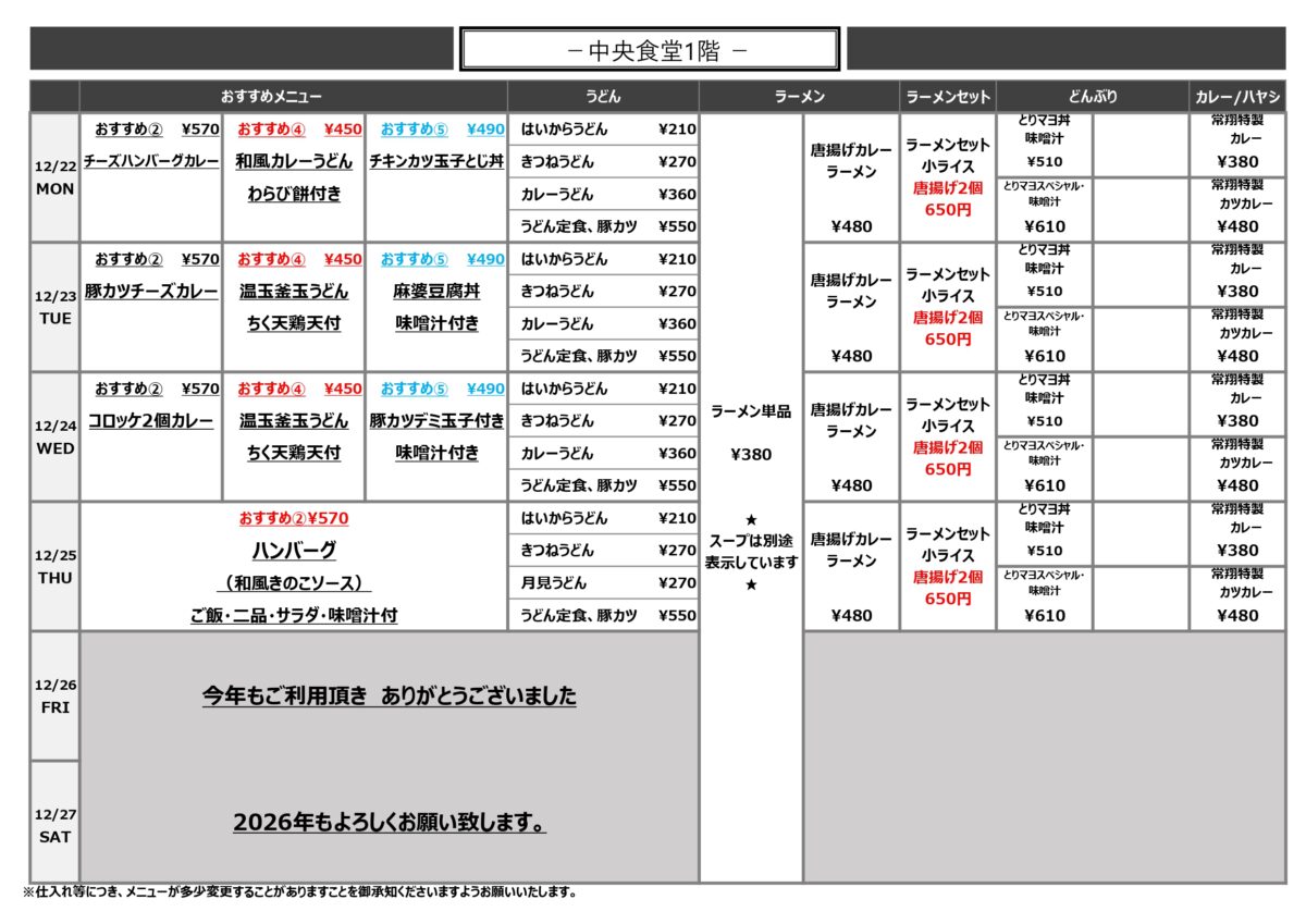 【大工大】大宮:中央食堂1階 12月22日からの1週間メニュー