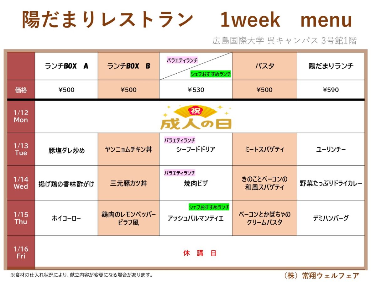 【広国大】呉: 陽だまりレストラン 1月12日からの1週間メニュー
