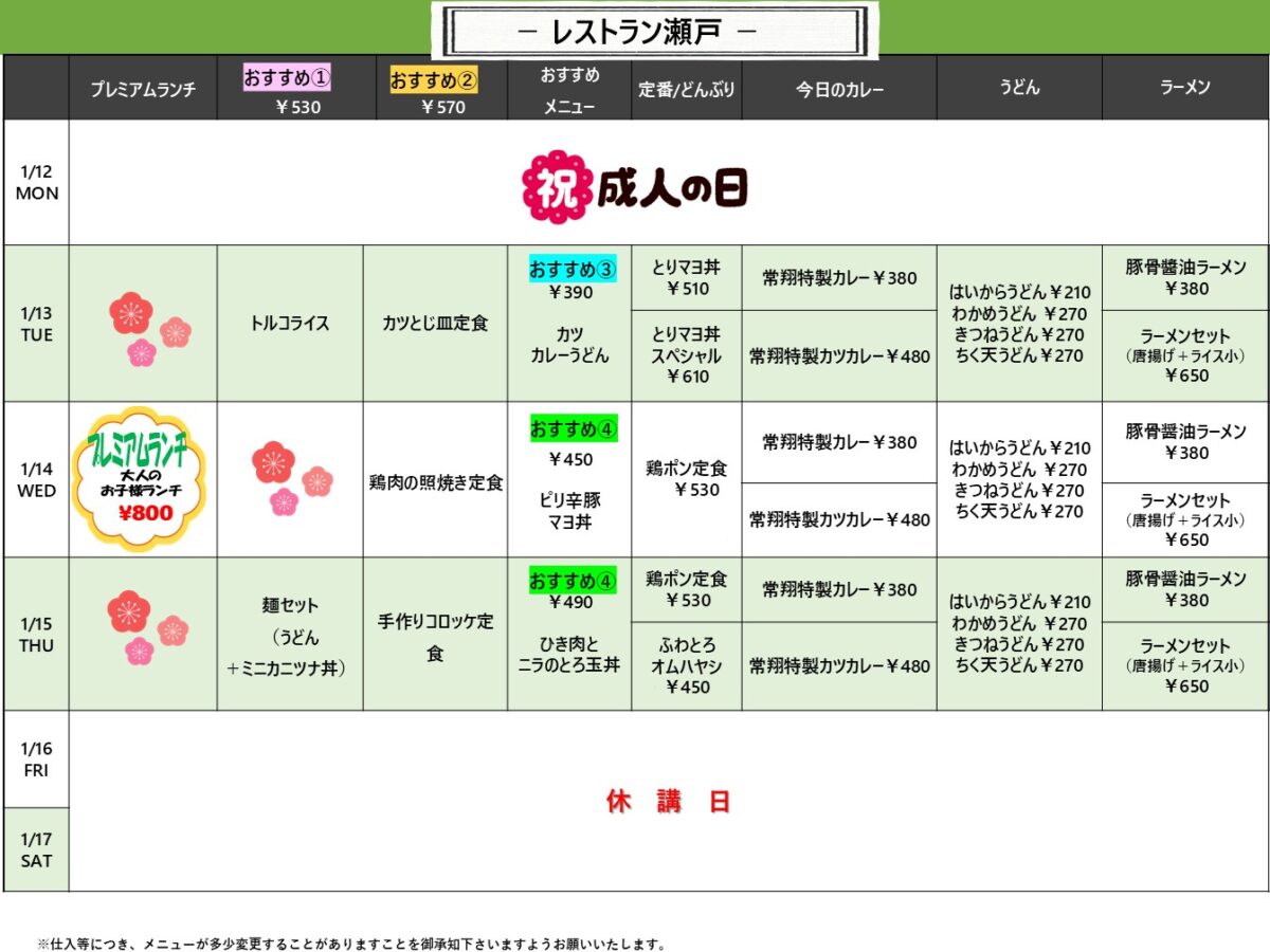 【広国大】呉: レストラン瀬戸 1月12日からの1週間メニュー