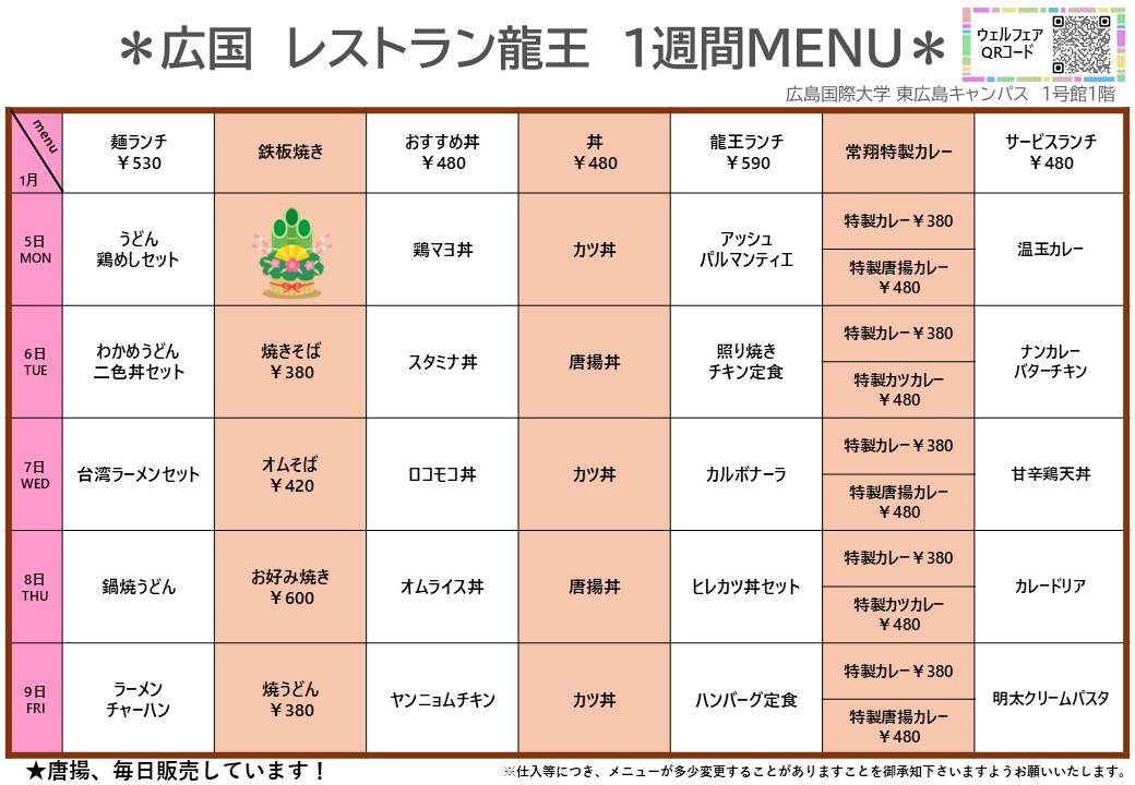 【広国大】東広島:レストラン龍王 1月5日からの1週間メニュー