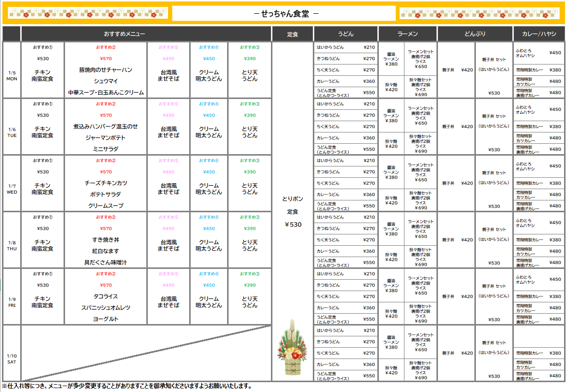 【摂南大】寝屋川:せっちゃん食堂 1月5日からの1週間メニュー