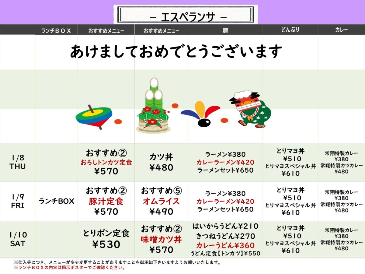 【常翔学園中・高】エスペランサ 1月5日からの1週間メニュー