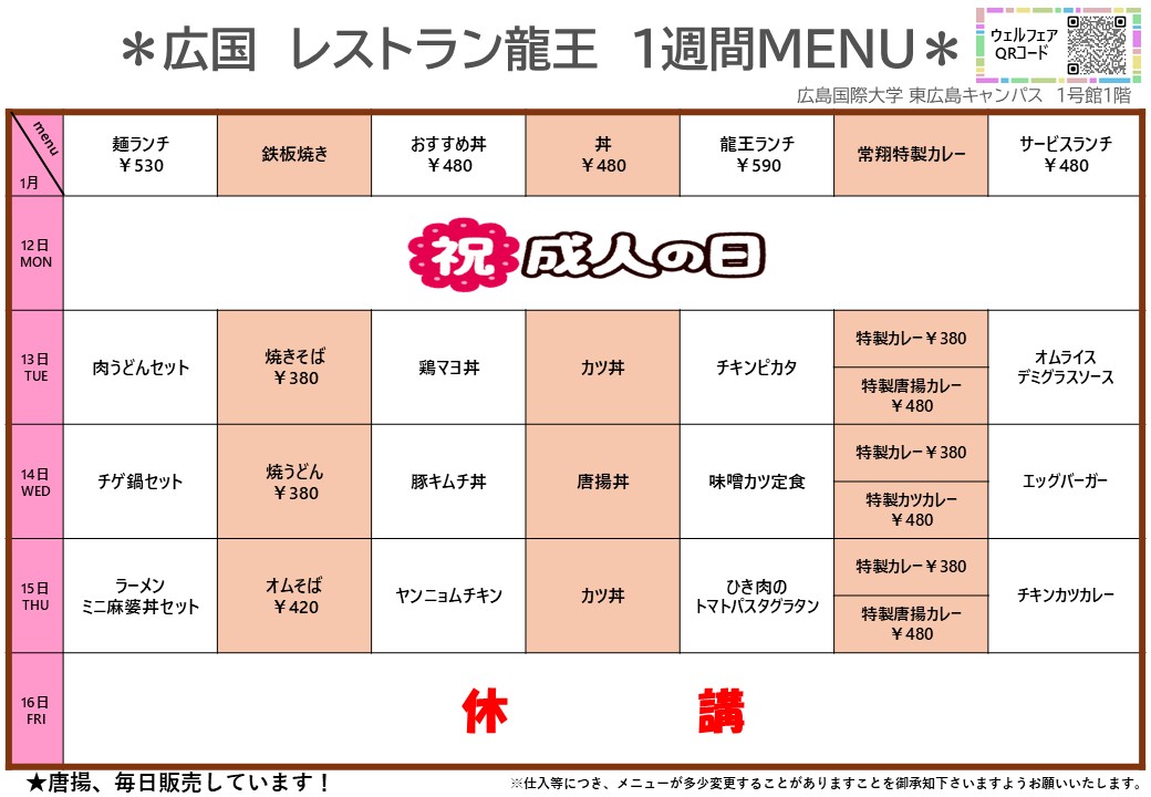 【広国大】東広島:レストラン龍王 1月12日からの1週間メニュー