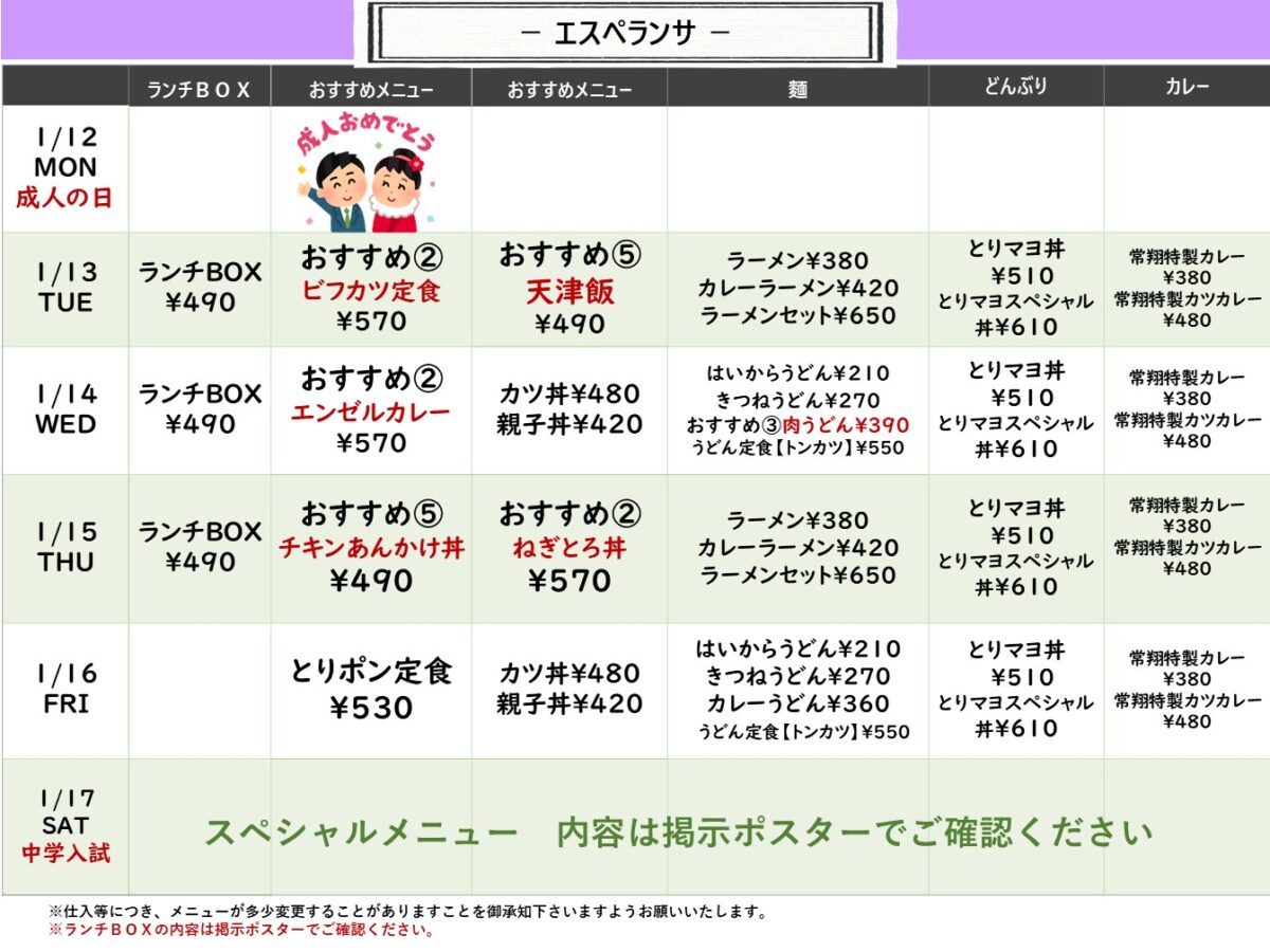 【常翔学園中・高】エスペランサ 1月12日からの1週間メニュー