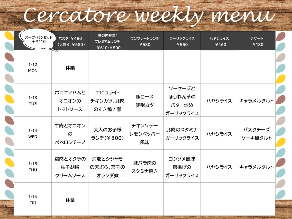 【大工大】大宮:チェルカトーレ 1月12日からの1週間メニュー