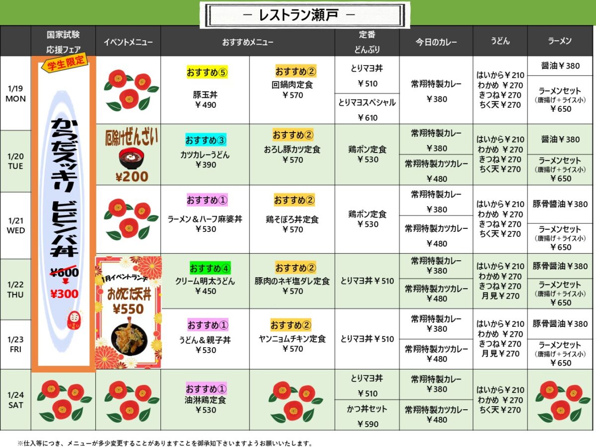 【広国大】呉: レストラン瀬戸 1月19日からの1週間メニュー