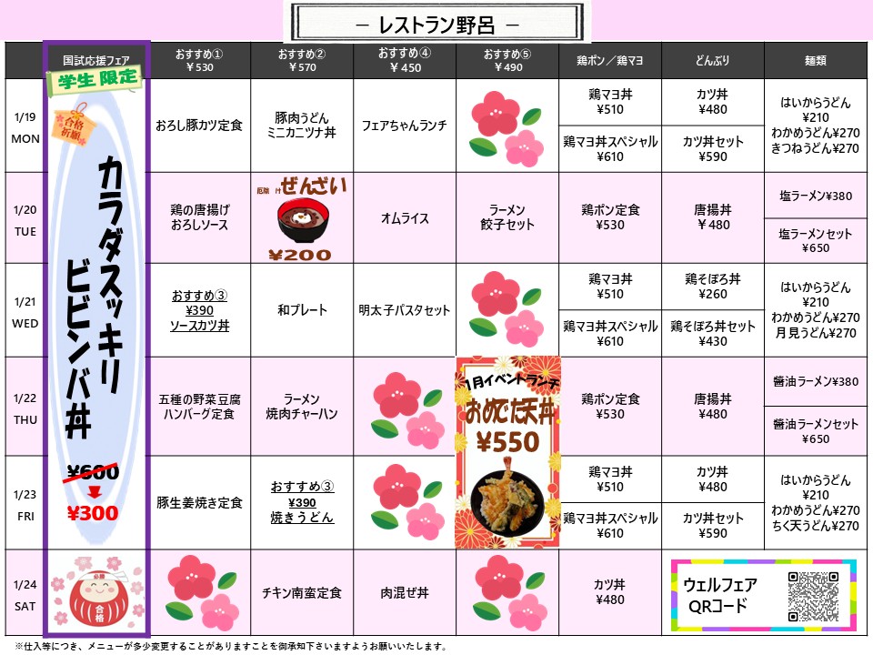 【広国大】東広島:レストラン野呂 1月19日からの1週間メニュー