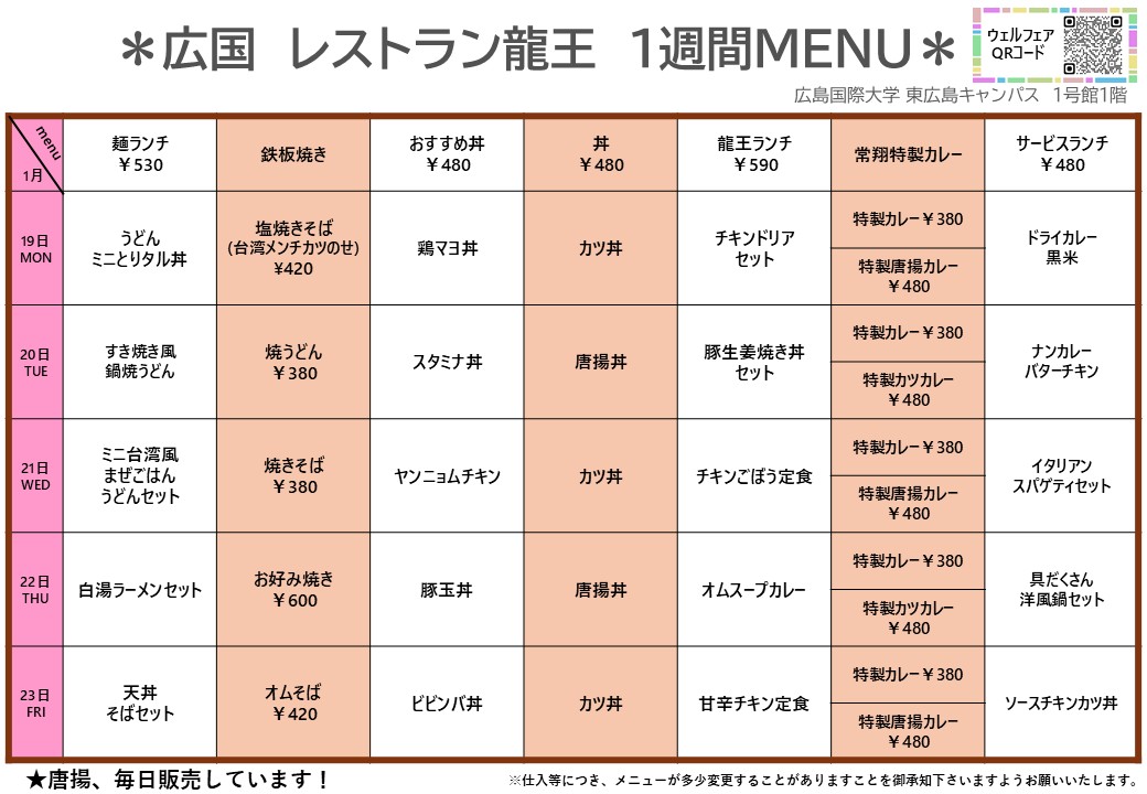 【広国大】東広島:レストラン龍王 1月19日からの1週間メニュー