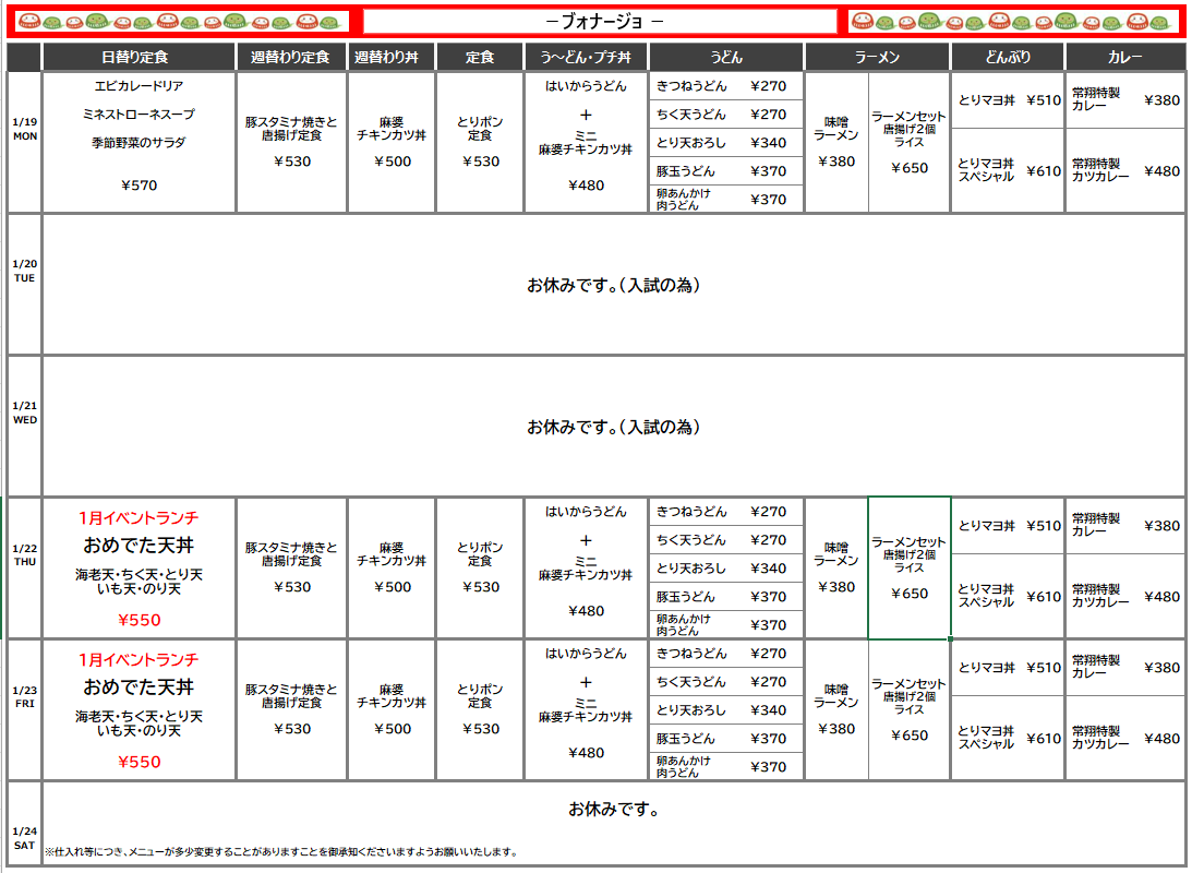 【摂南大】寝屋川:ブォナージョ 1月19日からの1週間メニュー