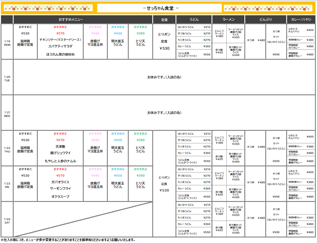 【摂南大】寝屋川:せっちゃん食堂 1月19日からの1週間メニュー