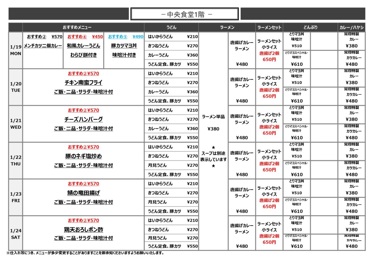 【大工大】大宮:中央食堂1階 1月19日からの1週間メニュー
