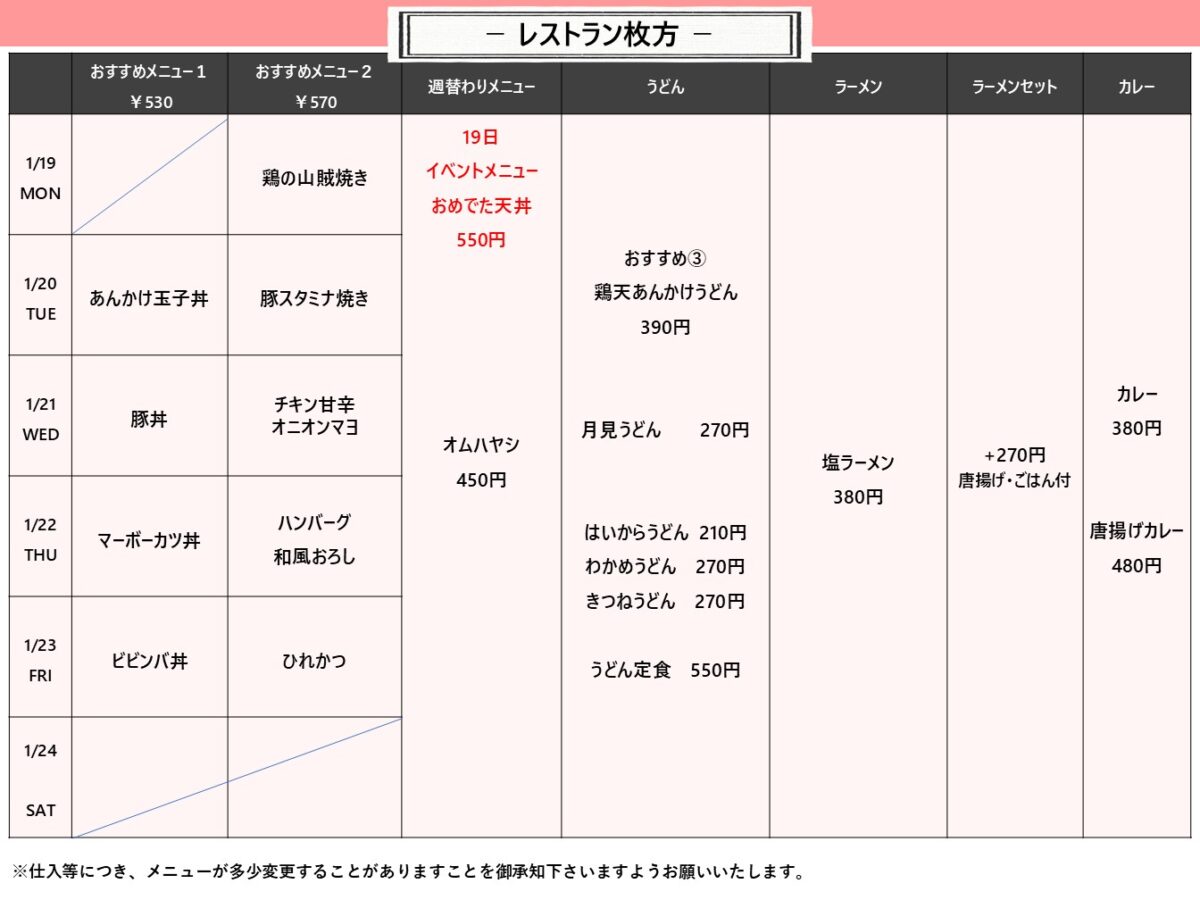 【摂南大】枚方:枚方食堂 1月19日からの1週間メニュー