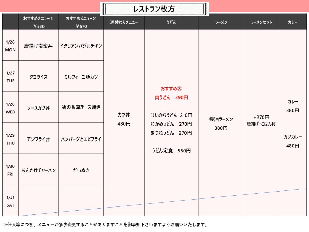【摂南大】枚方:枚方食堂 1月26日からの1週間メニュー