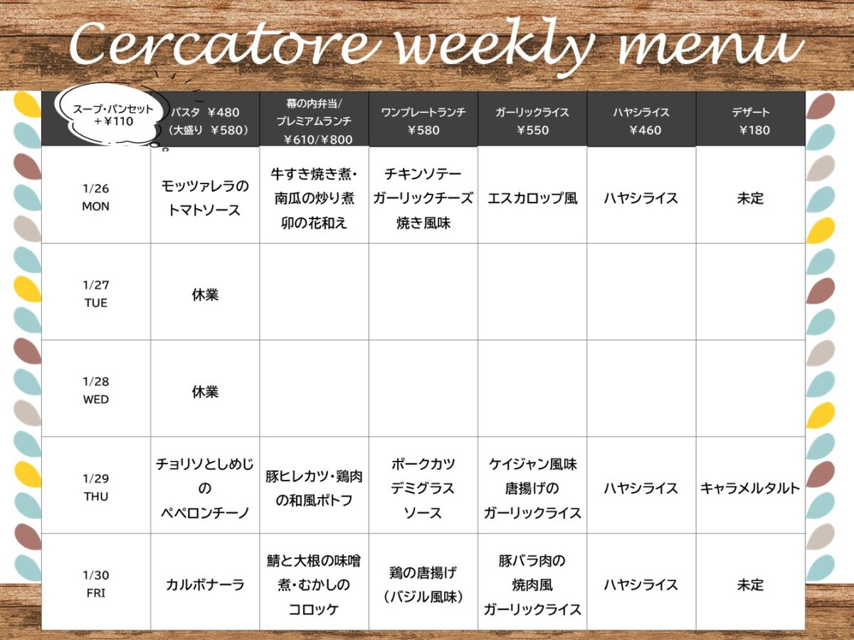 【大工大】大宮:チェルカトーレ 1月26日からの1週間メニュー