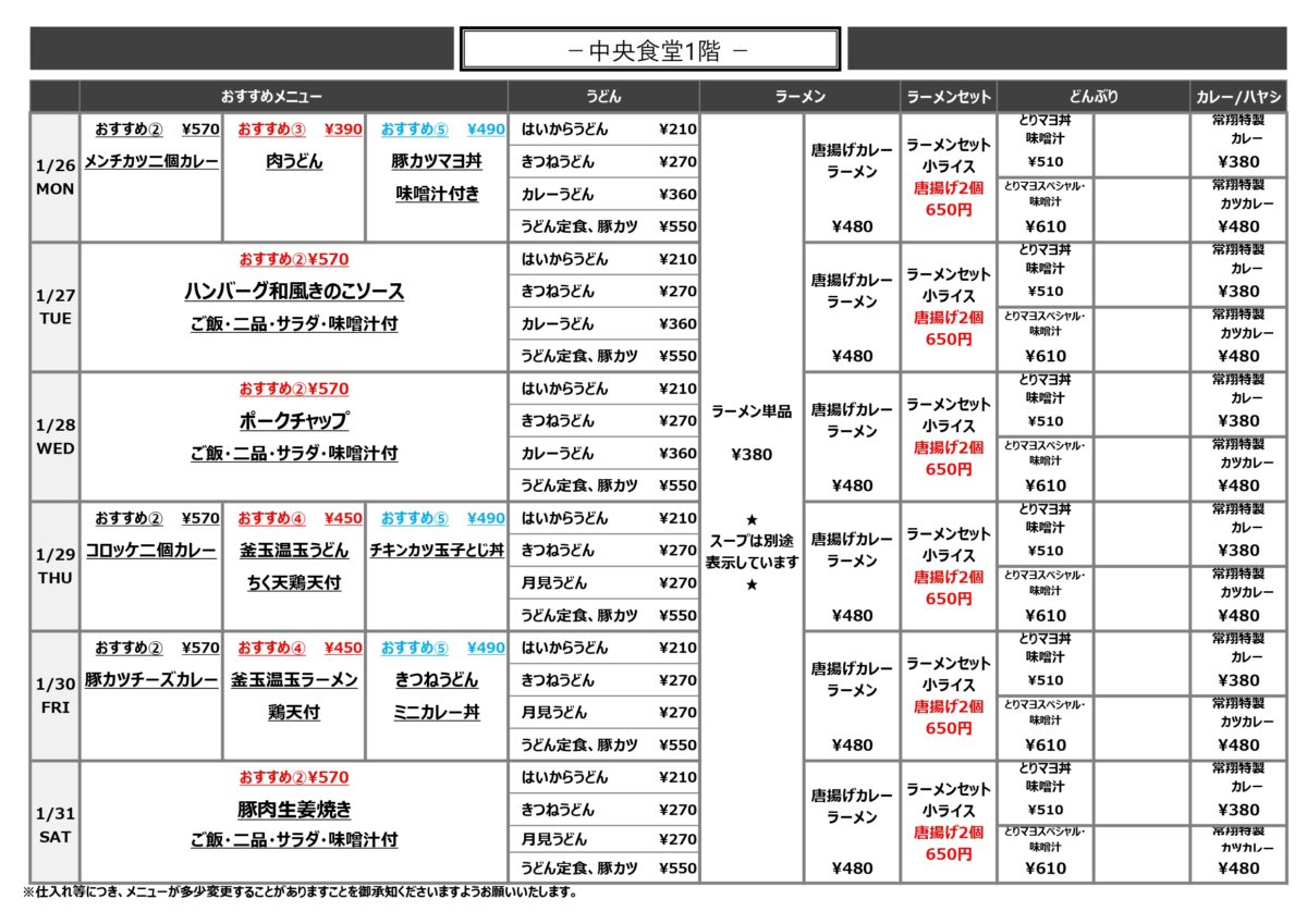 【大工大】大宮:中央食堂1階 1月26日からの1週間メニュー