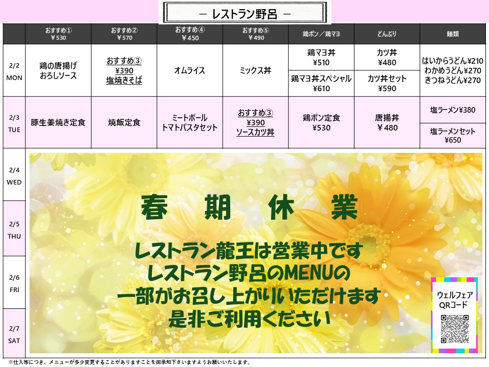 【広国大】東広島:レストラン野呂 2月2日からの1週間メニュー