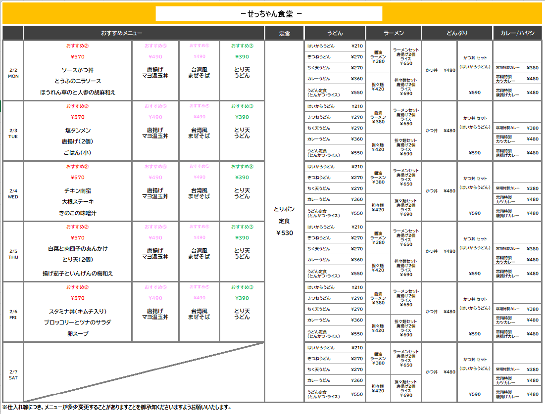 【摂南大】寝屋川:せっちゃん食堂 2月2日からの1週間メニュー