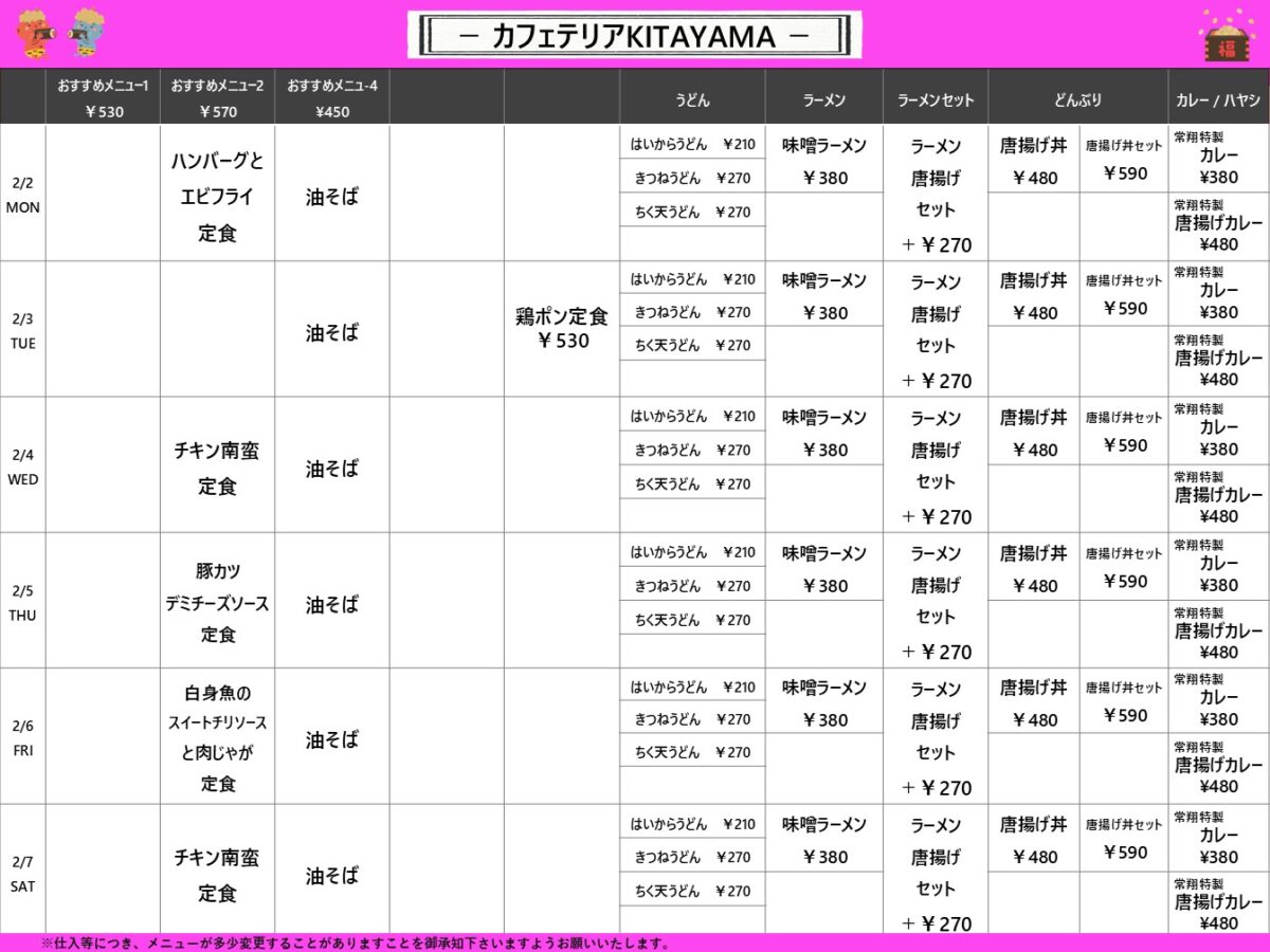 【大工大】枚方:カフェテリアKITAYAMA 2月2日からの1週間メニュー