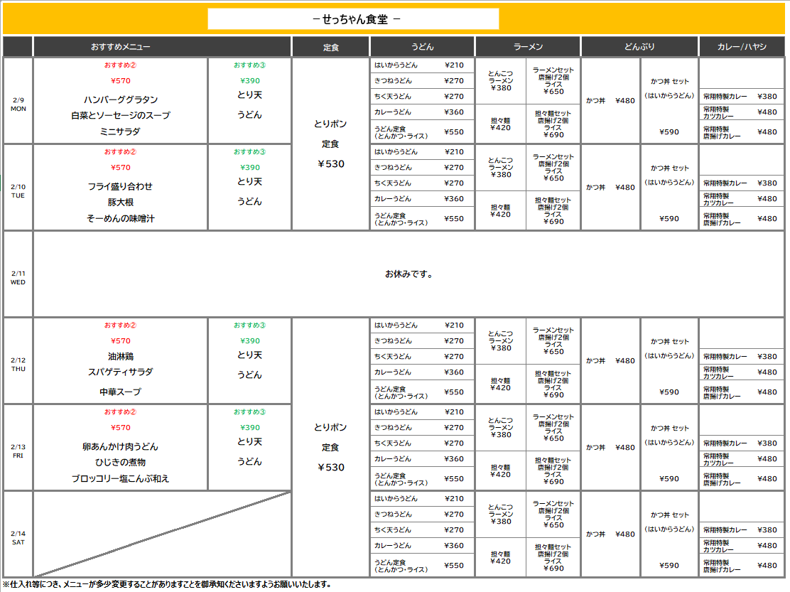 【摂南大】寝屋川:せっちゃん食堂 2月9日からの1週間メニュー