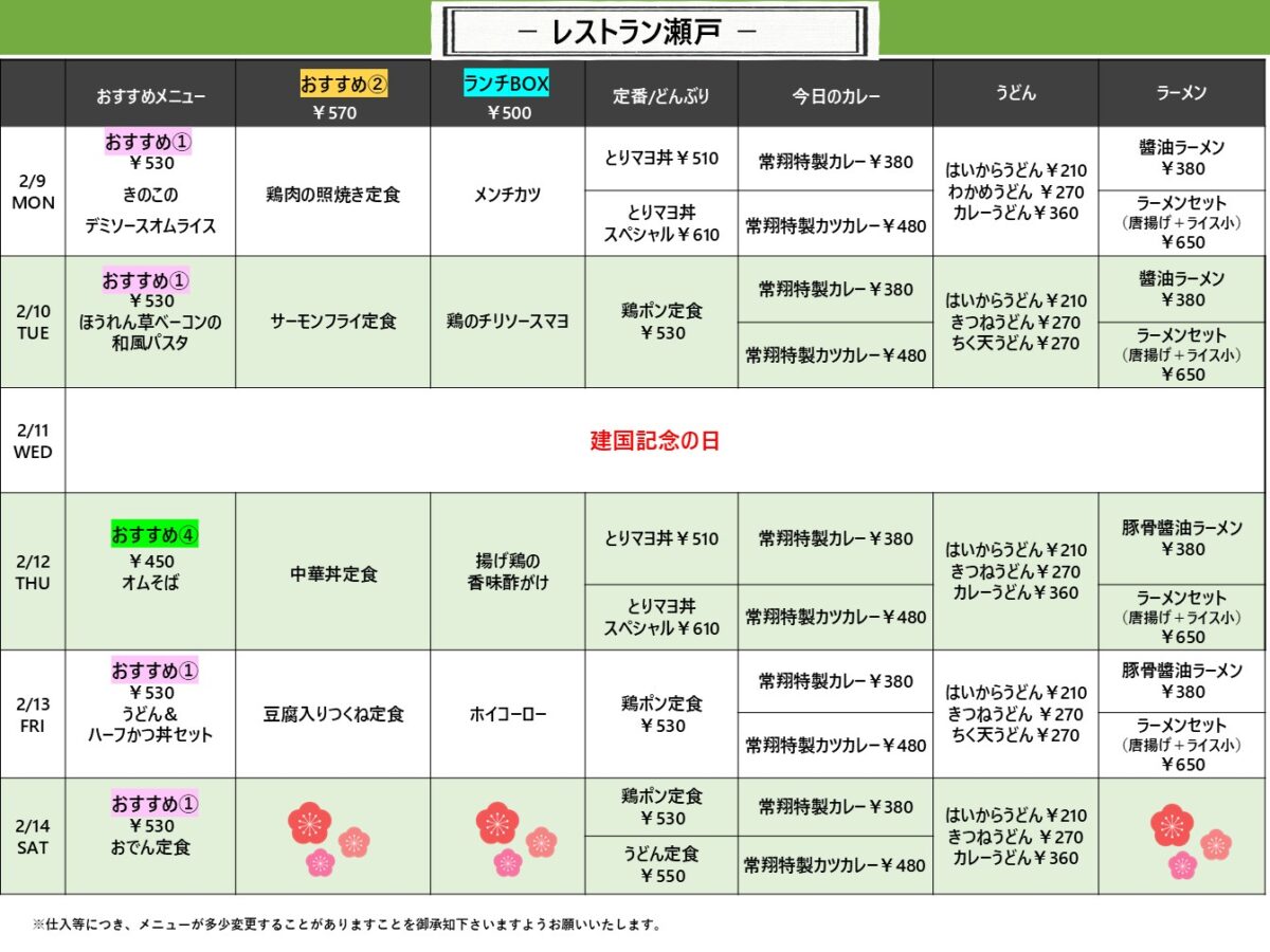 【広国大】呉: レストラン瀬戸 2月9日からの1週間メニュー