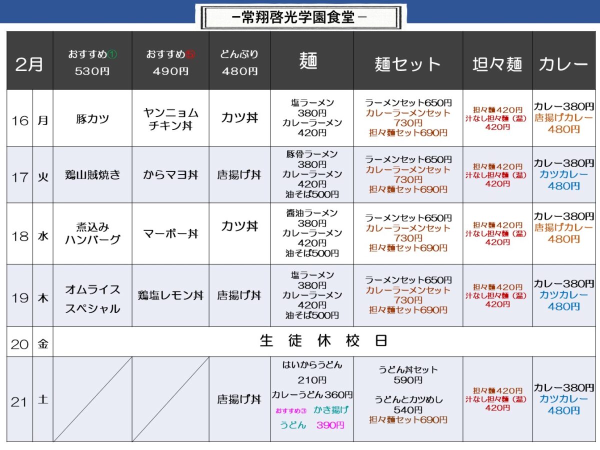 【常翔啓光中・高】啓光学園食堂 2月16日からの1週間メニュー