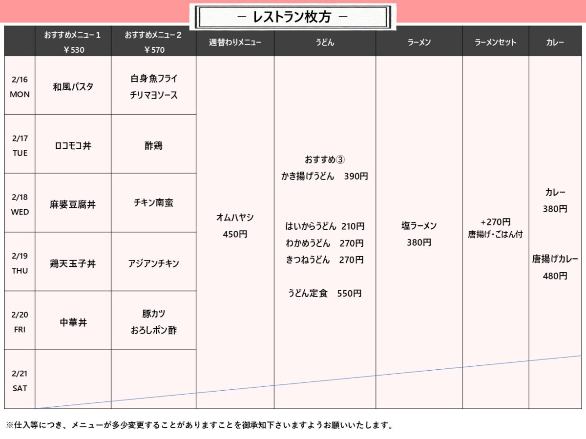 【摂南大】枚方:枚方食堂 2月16日からの1週間メニュー