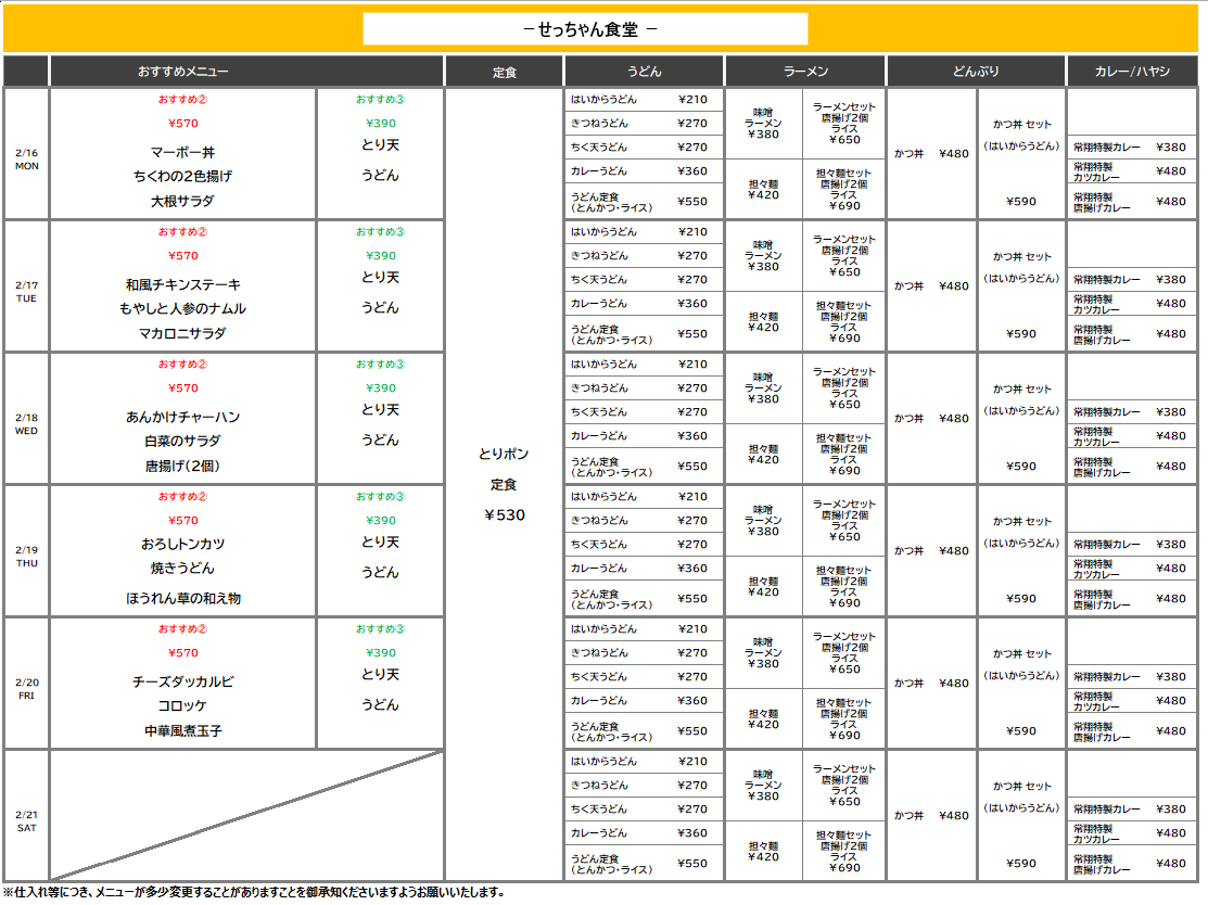 【摂南大】寝屋川:せっちゃん食堂 2月16日からの1週間メニュー