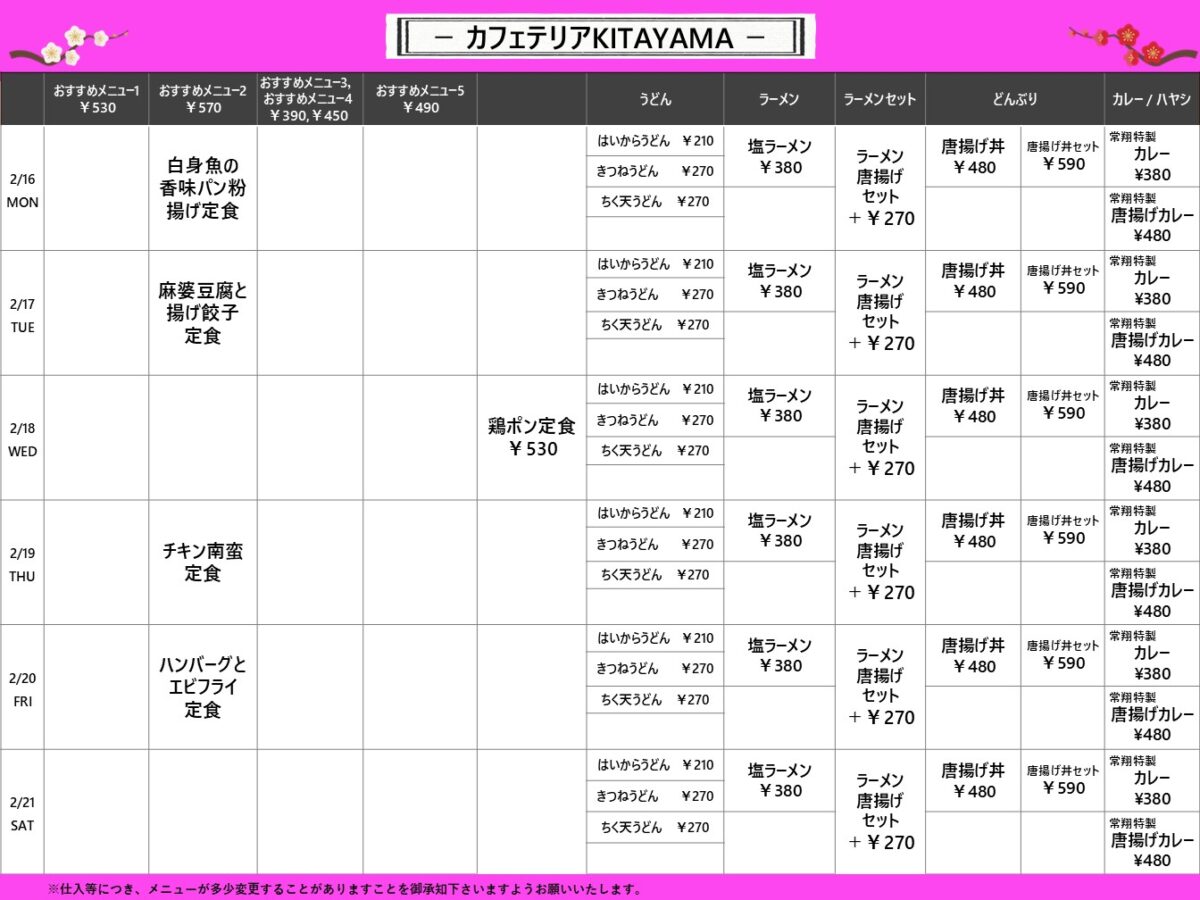 【工大】枚方:カフェテリアKITAYAMA 2月16日からの1週間メニュー